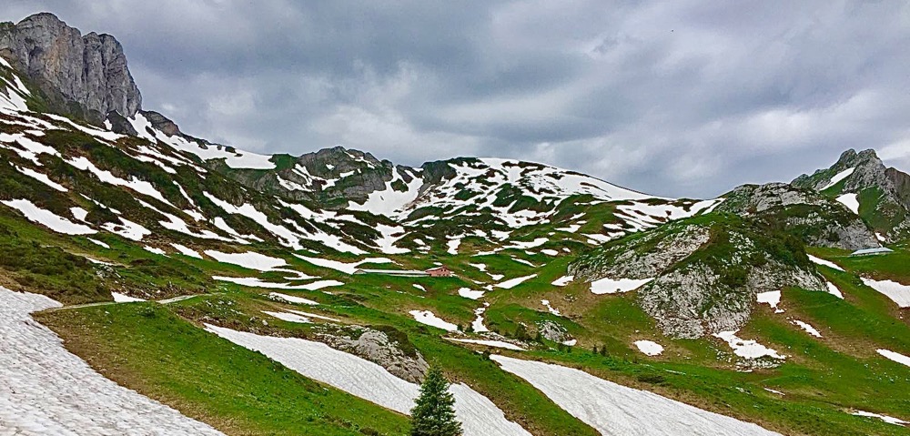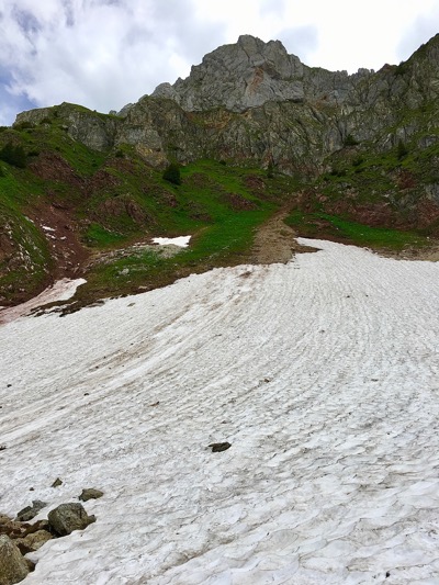 La montée vers le lac, rien à dire. C’est de la route, c’est assez raide, c’est plein de monde. C’est un peu normal parce que l’endroit est paradisiaque. Un vrai paysage de carte postale. Après le lac, c’est autre chose. Nous sommes le 10 juin et la neige est encore bien présente. Puis Chambairy, il faut vouloir y aller…