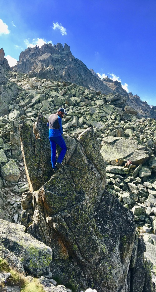 Les blocs sont énormes et je navigue à vue entre cairns et vestiges de traces de peinture. Je suis souvent obligé de m’aider de mes mains. Parfois même je dois redescendre quelques mètres pour changer de parcours car je suis bloqué par la hauteur d’un bloc ou parce que je ne peux pas faire l’enjambée nécessaire pour passer au suivant. Le sommet semble s’éloigner à chaque pas. Je vois mes trois compères qui avancent à un bon rythme. Quelques gros mots me viennent à l’esprit mais j’arrive encore à les contenir. Je me concentre sur mes pas.