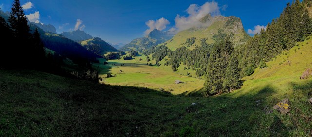 En ce magnifique mois d’août me voilà de nouveau avec des fourmis dans le sac. Il fait beau et je dois trouver une sortie qui me permettent d’atteindre le sommet. Je suis resté un peu sur ma faim après la Pointe de Paray. Aussi j’étudie soigneusement les topos afin d’être sûr de mon coup ! Quelques belles photos ont attiré mon attention mais je trouve la balade un peu courte. Je cherche encore et je trouve un autre itinéraire, trop court lui aussi mais il pourrait parfaitement se combiner pour faire une belle boucle. C’est décidé, la Dent de Savigny sera dans ma collection ce soir, direction le parking du Gros Mont. Arriver jusque-là est déjà une épreuve tant la route est sinueuse mais bientôt je suis sur le sentier qui monte au dessus de la Féguelena. C’est un chemin agréable qui traverse les pâturages et ensuite le sous-bois. Le paysage est magnifique. Le plateau marécageux bifurque vers le Vallon des Morteys et même si le Vanil Noir se cache dans les nuages on aperçoit la Dent de Brenleire et la Dent des Bimis qui donnent une idée de la beauté du lieu.
