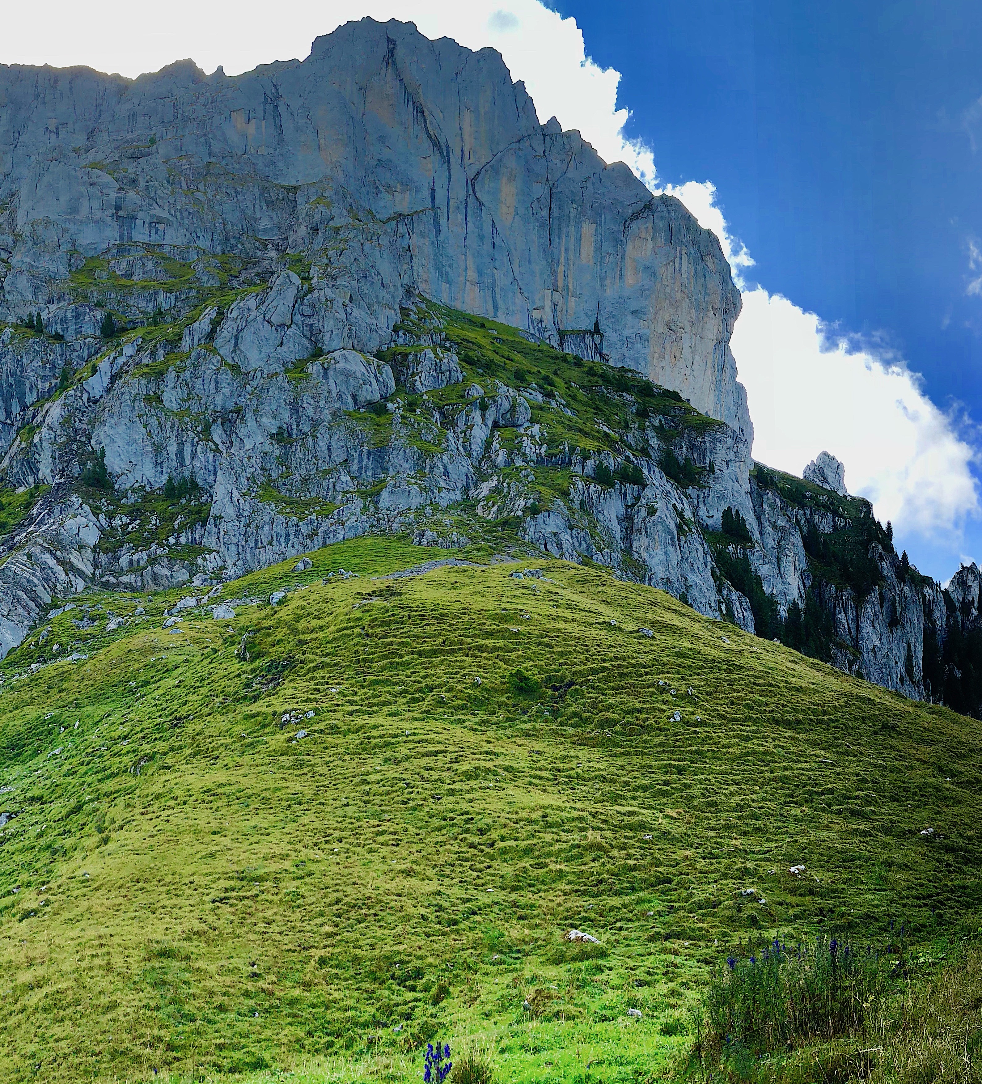 Je progresse tranquillement, sûr de mon objectif et j’atteins le pied de la Dent. Calmé, le sentier longe le rocher qui forme un mur parfaitement vertical. Le paysage est un inventaire des sommets les plus fameux du canton de Fribourg, on peut voir de la Hochmatt jusqu’au Vanil Noir en passant les Dents de Brenleire et Folliéran. Aujourd’hui les nuages jouent autour du plus haut d’entre eux en n’empêchant de voir L’Écri et la pointe de Paray. Je continue vers la porte de Savigny pour profiter un moment de cette vue en grignotant quelques noisettes. Le terrain est toujours gras et je considère la question de continuer vers le sommet ou de partir directement en direction des Pucelles. J’aimerais vraiment ajouter une croix à ma collection d’autant que celle de la Dent de Savigny est assez esthétique. Je croque un dernier fruit sec et je passe le col. Direction la cime !